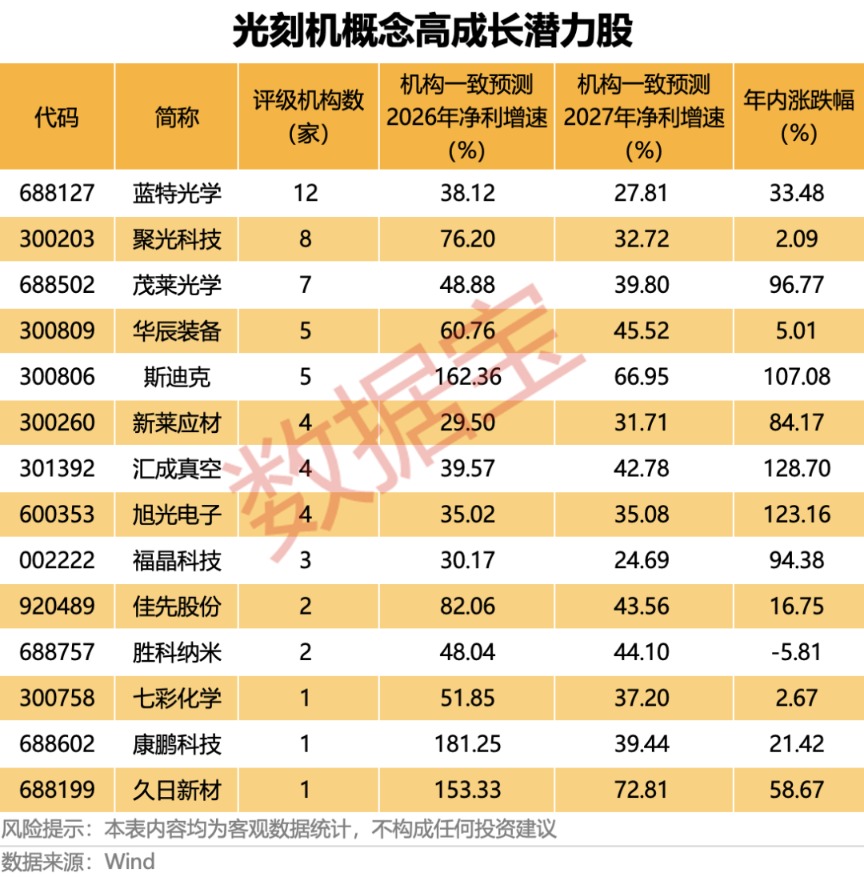 部分个股成长性值得期待。根据机构一致预测,蓝特光学、聚光科技、茂莱光学等个股2026年、2027年净利增速均超20%。其中,聚光科技、茂莱光学、华辰装备等机构一致预测明后两年净利增速均超30%。