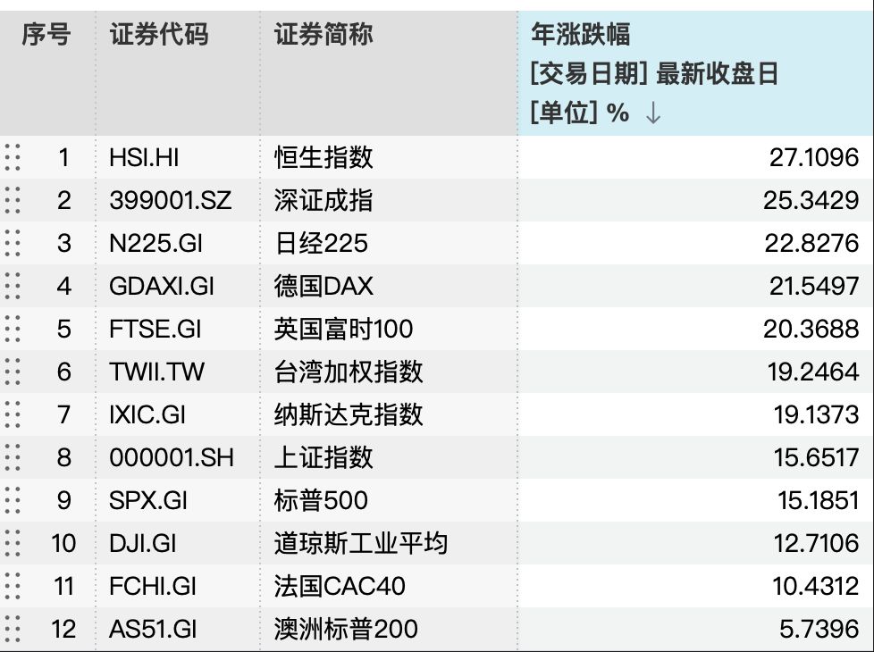 首先是资金面,南向资金累计净买入港股已超过1.4万亿港元,已经接近过去三年南向资金累计净买入额。正是在此背景下,港股今年不仅仅是近八年最强表现,同时恒指也是今年全球主要市场估值的领涨指数。