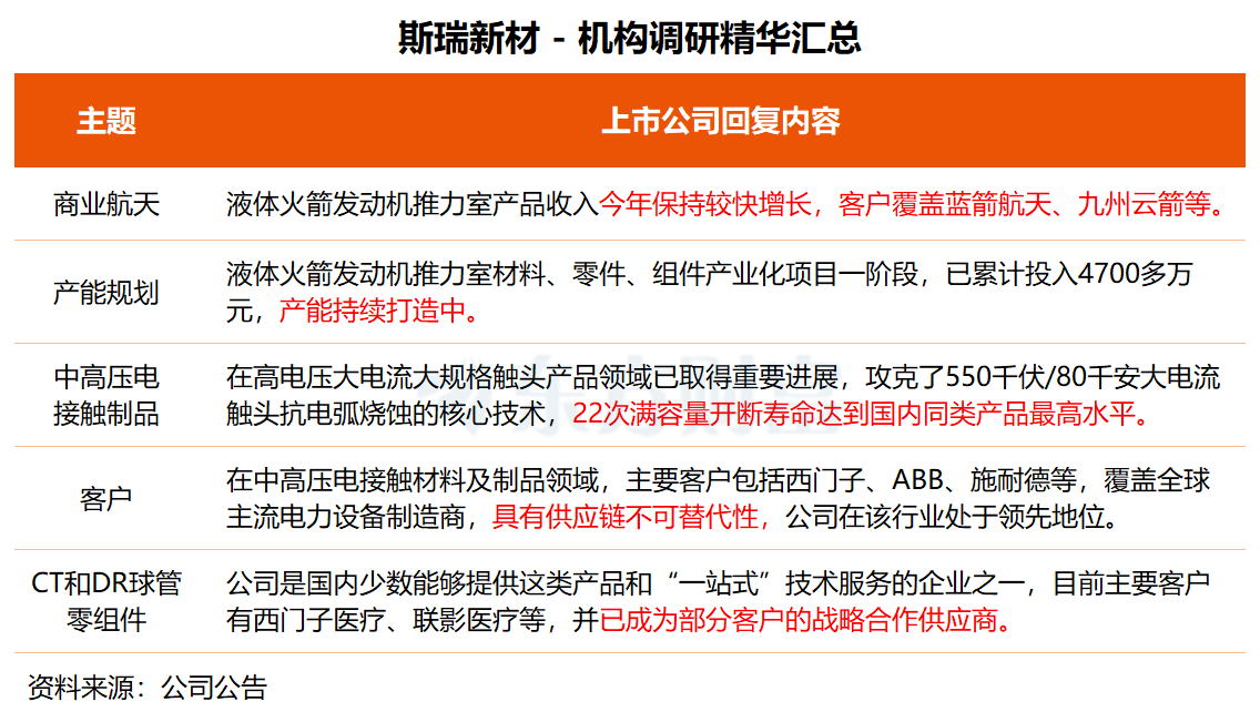 在调研中,斯瑞新材表示,随着全球商业航天的快速发展,公司液体火箭发动机推力室产品收入从2022年的2097.16万元增长到2024年的3016.22万元,今年亦保持较快增长,客户覆盖蓝箭航天、九州云箭等。