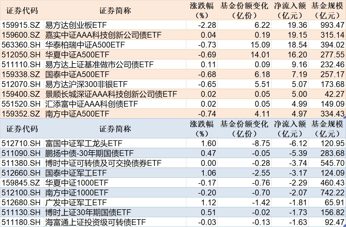 Wind数据显示,在12月18日的非货币ETF市场中,易方达创业板ETF基金份额增加6.22亿份,净流入额19.36亿元;嘉实中证AAA科技创新公司债ETF份额增加0.19亿份,净流入额19.15亿元;华泰柏瑞中证A500ETF份额增加15.09亿份,净流入额18.54亿元。