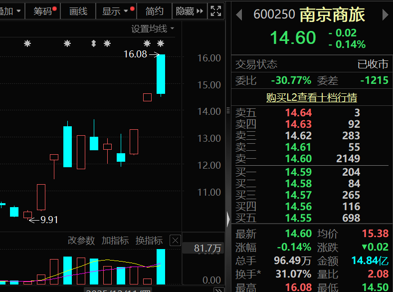 从行情看,南京商旅近期走势凌厉,12月8日至今累计涨幅超42%,区间有5个涨停板。