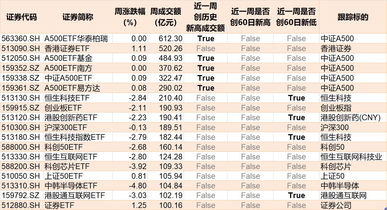 其中,A500ETF华泰柏瑞周成交额超600亿元,多只中证A500相关ETF周成交额创新高。另外,本周多只港股相关ETF创近60日新低。