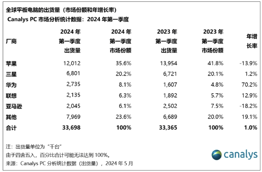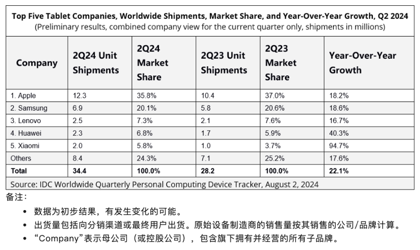 IDC初步数据显示,2024年第二季度全球平板电脑市场出货量为3,440万台,同比增长22.1%。出货量排名前五的厂商依次是苹果、三星、联想、华为、小米。