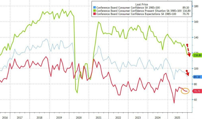 衡量美国人对短期收入、商业状况和就业市场预期的指标保持在70.7不变,但仍远低于80——通常被视为可能预示经济衰退的信号。这一指标已连续11个月低于80。