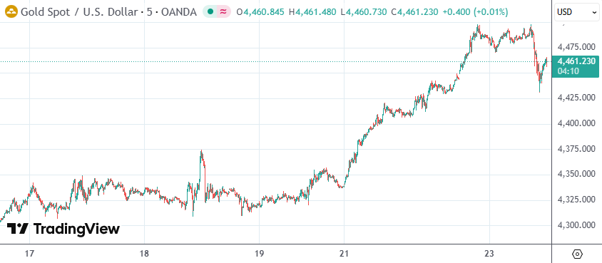 周二(12月23日)纽市早盘,现货黄金价格一度升至每盎司4497.89美元,日内涨幅最大时达到1.2%,连续第二日刷新高,非常接近4500美元关口,现回落至4461美元附近。