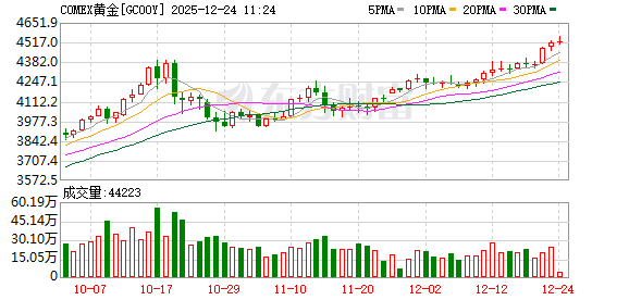 国际金银持续拉升,续创历史新高,12月24日亚洲早盘,现货黄金走高首次升破4500美元/盎司关口。