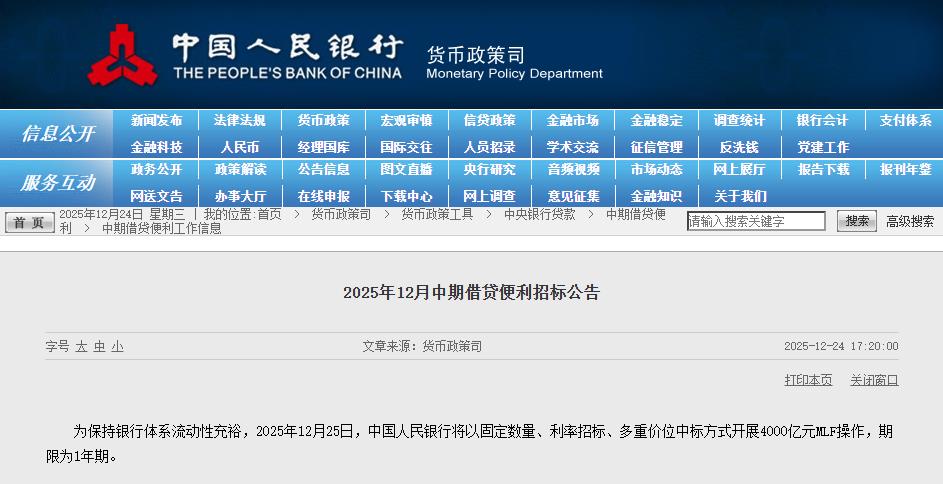 中国人民银行12月24日发布中期借贷便利招标公告称,为保持银行体系流动性充裕,2025年12月25日,将以固定数量、利率招标、多重价位中标方式开展4000亿元MLF操作,期限为1年期。