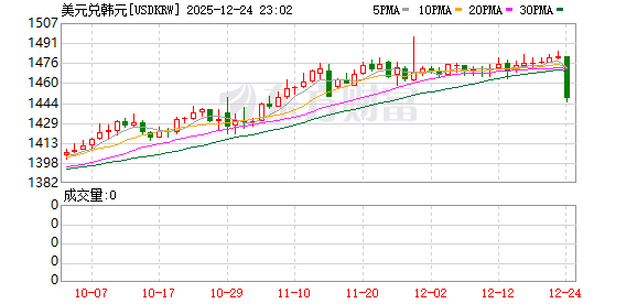 受上述消息刺激,韩元汇率直线爆拉,日内一度暴涨2.5%,最高升至1美元兑1443.79韩元。在此之前,韩元一度贬值至1美元兑1485韩元,逼近2009年全球金融危机以来的最低水平。
