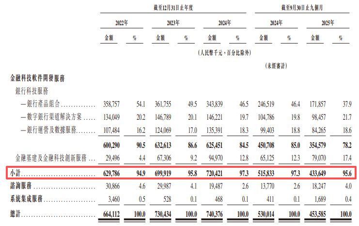 不过,2022年、2023年、2024年和2025年前三季度(下称“报告期内”),四方精创的绝大多数收入均来自金融科技软件开发服务,收入占比分别为94.9%、95.8%、97.3%和95.6%。