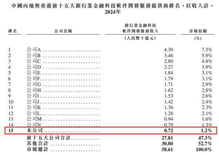 招股书援引灼识咨询的资料称,按2024年金融科技软件开发服务市场产生的收入计,四方精创在中国内地及香港的金融科技软件开发服务市场中仅排名第15,市场份额仅1.2%。在巨头林立(如同一天亦向港交所递表的宇信科技)的中国内地市场,公司几乎没有定价权。