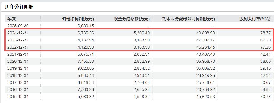 A股上市至今,四方精创已累计分红10次,累计现金分红近3亿元,平均分红率为40.32%。需要指出的是,2022年—2024年,四方精创的股利支付率均超过67%,分别为77.26%、67.2%和78.77%,其中2024年公司归母净利润为6736.36万元,但现金分红总额就达到了5306.49万元。