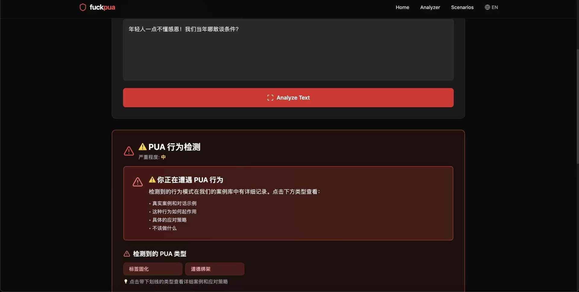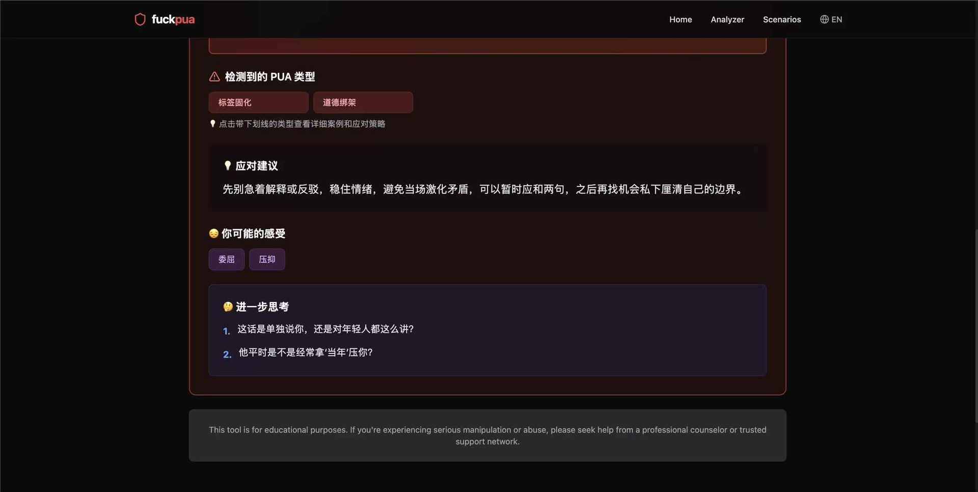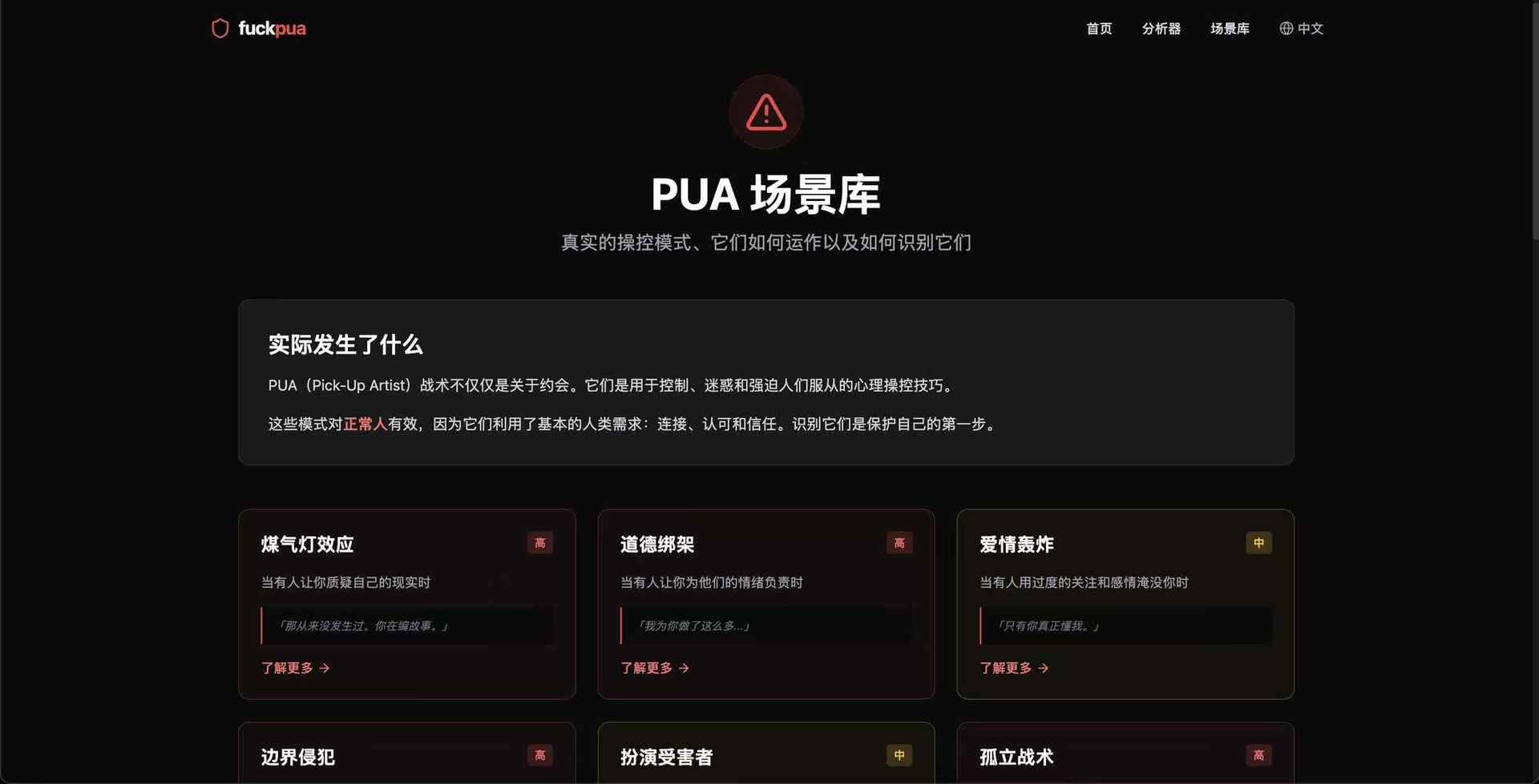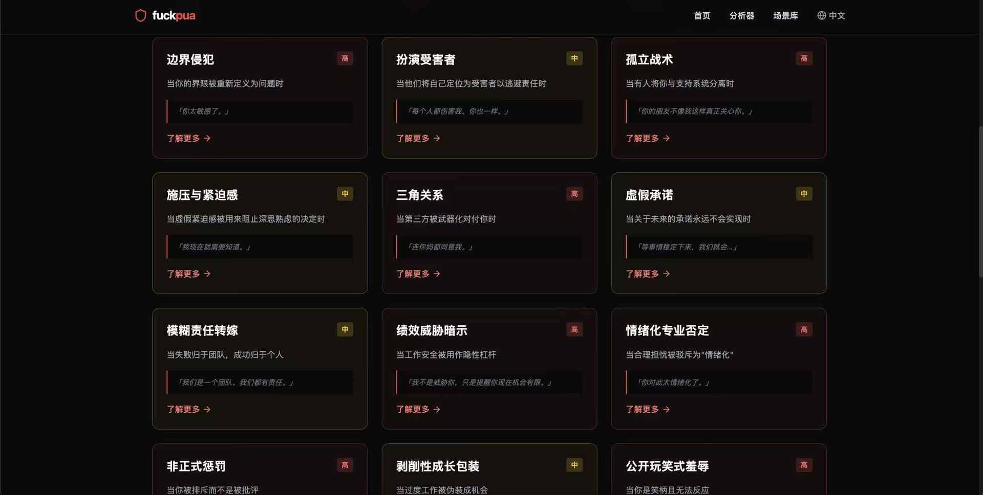 其实我们这一生一直在被 pua。小时候,大人常见的是 “别人家的孩子都能做到,你怎么不行”,长大了,劝你 “忍一忍也是为你好”,到了学校和工作里,领导说 “我对你期望很高,所以才要求严格”,恋爱了,对象说 “如果你真的在乎我,就不会这样想”,然后开始为了证明自己而一次次退让。我越来越清楚:这些测试本就不该通过。我深恶痛绝,于是做了一个反 PUA 的免费网站,能检测你是否正在经历 pua,pua 的类型是什么,让更多人识别原理 pua,如果给我一次再来一次的机会,我希望所有的测试都没通过。人生应该自己掌握 地址:https://www.saynopua.com/
