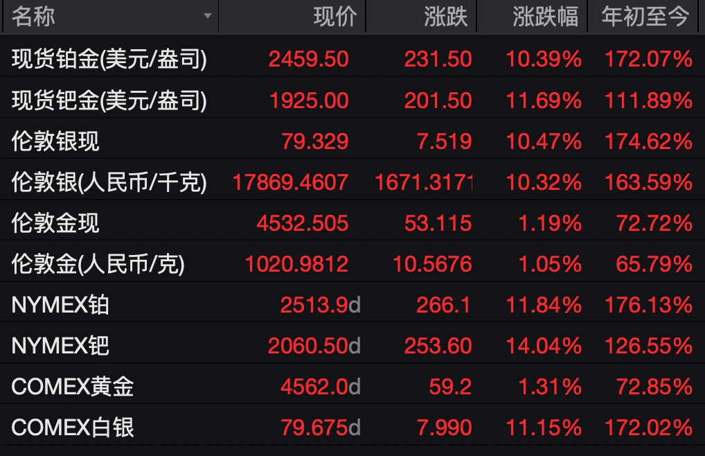 白银暴涨10%,接近20元/克;现货黄金站上4549美元/盎司,刷新历史高位;铂金大涨,铂金首饰价格每克破千……