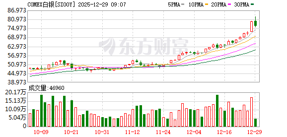 12月份,白银价格大幅飙升,这是贵金属市场整体火爆行情的一部分。周一亚市交易时段,现货白银一度涨超5%,站上83美元/盎司上方,继续刷新历史新高。截至目前,现货白银报81美元,日内上涨逾2%,为连续第六个交易日上涨。