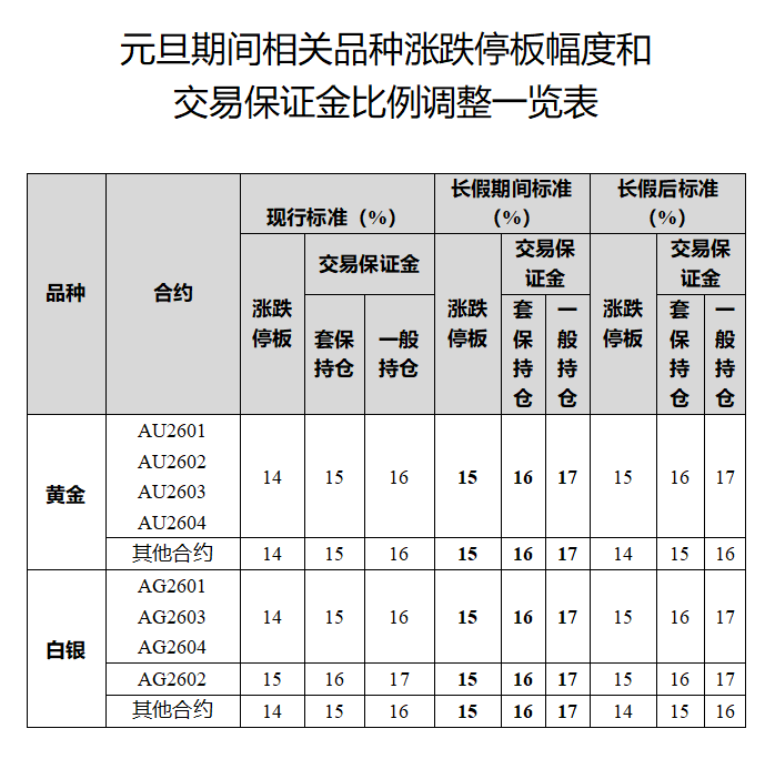 元旦假期临近,上期所同日发布《关于2026年元旦期间有关工作安排的通知》,对黄金、白银相关期货合约的涨跌停板幅度及交易保证金比例做出调整。