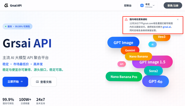 如果你有魔法建议还是继续使用Grsai.com这个主域名,如果没有可以访问国内直连Grsai.ai两个站都会同时运营维护,不会跑路所以放心使用,APi 调用上有任何问题都可以找我解答!