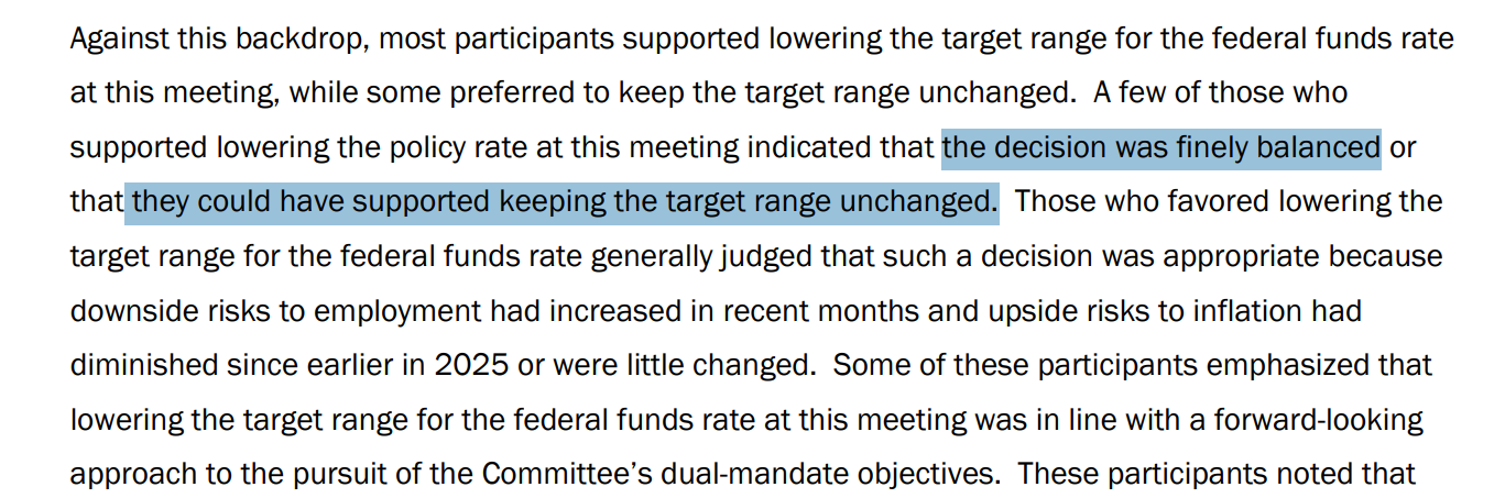 作为背景,美联储本月如期降息25个基点,联邦基金利率目标区间下调至3.50%至3.75%。本次决议以9票赞成,3票反对获得通过,为2019年以来异议数量最高的一次。其中来自白宫的米兰认为应该降息50个基点,而堪萨斯城联储主席施密德与芝加哥联储主席古尔斯比反对降息。