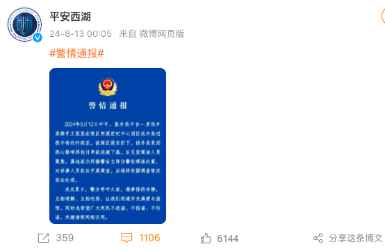 【TechWeb】8月13日消息,8月13日凌晨,杭州市公安局西湖分局发布警情通报,称有男性外卖骑手在送餐过程中因踩歪围栏与园区保安发生冲突后下跪,引发现场人员聚集。已对涉事人员依法开展调查,后续将依据调查情况依法处理,并呼吁大家遇事保持冷静,希望广大网民不造谣、不信谣、不传谣。