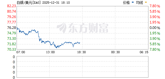 12月31日,以白银为首的贵金属市场全线重挫,现货白银一度跌破71美元/盎司关口,截至15:30,日内跌幅超5%,报72.12美元/盎司。其他贵金属亦集体大跌,现货铂金暴跌超11%,现货钯金大跌超5%。