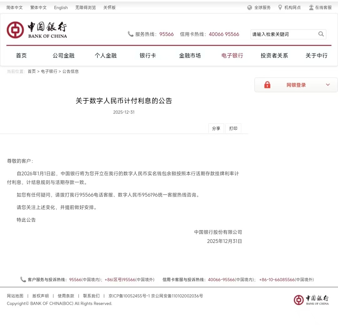 12月31日,中国银行、工商银行、农业银行、建设银行、交通银行、邮储银行六家国有大行相继发布公告称,2026年1月1日起,将为开立在该行的数字人民币实名钱包余额按照该行活期存款挂牌利率计付利息,计结息规则与活期存款一致。