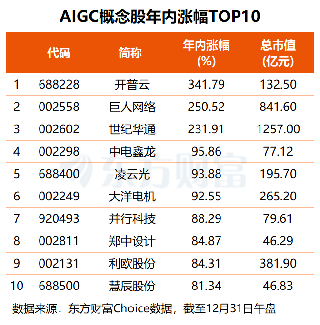 截至今日午盘,共88只AIGC概念股年内股价实现上涨,占比超七成。开普云、巨人网络、世纪华通位居涨幅榜前三,三股今年分别大涨3.42、2.51、2.32倍。中电鑫龙、利欧股份、蓝色光标、汉得信息等24股年内涨幅均在50%至100%之间。