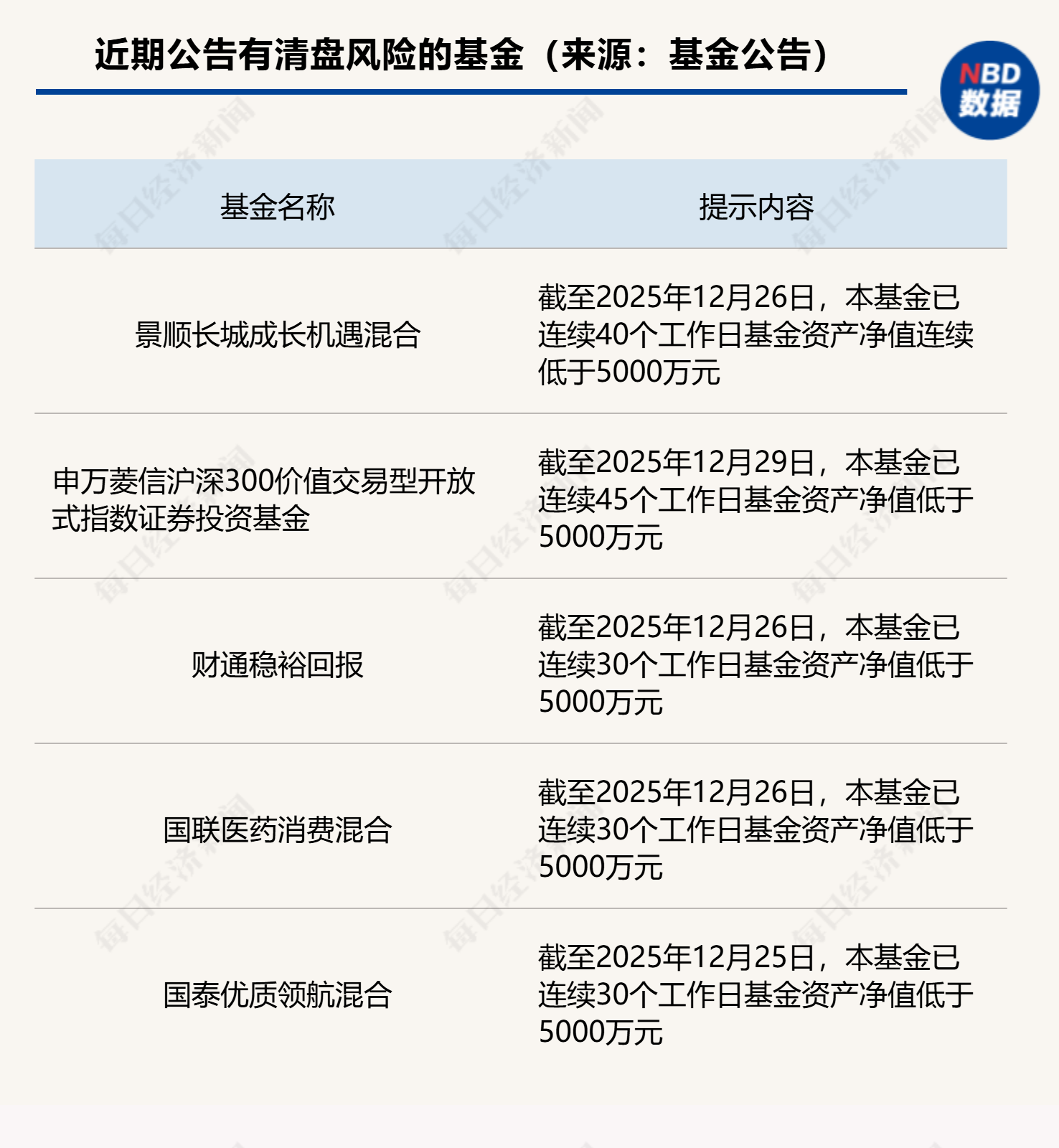 从相关基金现状来看,截至12月26日,景顺长城成长机遇混合已经连续40个工作日基金资产净值低于5000万元;财通稳裕回报连续30个工作日基金资产净值低于5000万元;截至12月29日,建信兴衡优选一年已连续30个工作日基金资产净值低于5000万元。