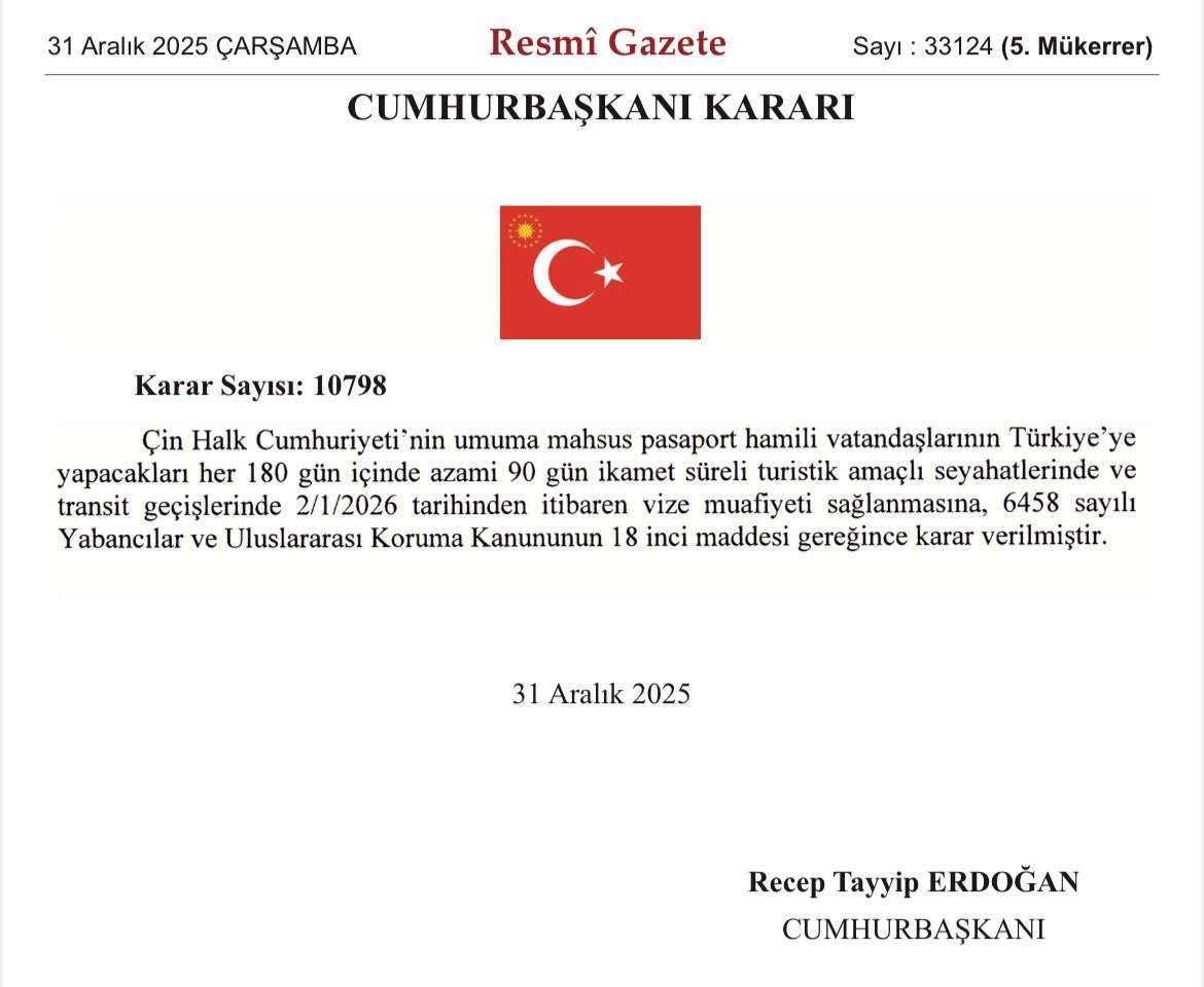 Home世界土耳其宣布对持普通护照中国公民免签 世界 2026 年 1 月 1 日 土耳其宣布对持普通护照中国公民免签 By 古方信息网 - Advertisement - 当地时间12月31日,土耳其《官方公报》发布总统令,宣布自2026年1月2日起,对持中国普通护照的公民实行免签入境政策。 根据规定,在每180天内,免签停留时间累计不超过90天,适用于旅游和过境目的。该决定依据土耳其《外国人和国际保护法》第18条作出。 (央视新闻) 文章转载自 东方财富 - Advertisement - Must Read 24小时 潘功胜:中国人民银行将实施好适度宽松的货币政策 古方信息网 - 2026 年 4 月 17 日 - Advertisement - 基金 港股互联网板块表现亮眼,港股通互联网ETF易方达(513040)近3日合计“吸金”超4000万元 2026 年 4 月 17 日 股票 港股复盘 | 恒生科技指数彻底涨“疯”了 百度涨近8% 网易、阿里涨超5% 2026 年 4 月 17 日 24小时 “杭州六小龙”第一股诞生!群核科技登陆港股 市值超300亿港元 2026 年 4 月 17 日 Related News 24小时 潘功胜:中国人民银行将实施好适度宽松的货币政策 2026 年 4 月 17 日 基金 港股互联网板块表现亮眼,港股通互联网ETF易方达(513040)近3日合计“吸金”超4000万元 2026 年 4 月 17 日 股票 港股复盘 | 恒生科技指数彻底涨“疯”了 百度涨近8% 网易、阿里涨超5% 2026 年 4 月 17 日 24小时 “杭州六小龙”第一股诞生!群核科技登陆港股 市值超300亿港元 2026 年 4 月 17 日 期货 深夜 两大指数创新高!特朗普:黎以停火10天 美伊可能本周末会谈! 2026 年 4 月 17 日 - Advertisement -