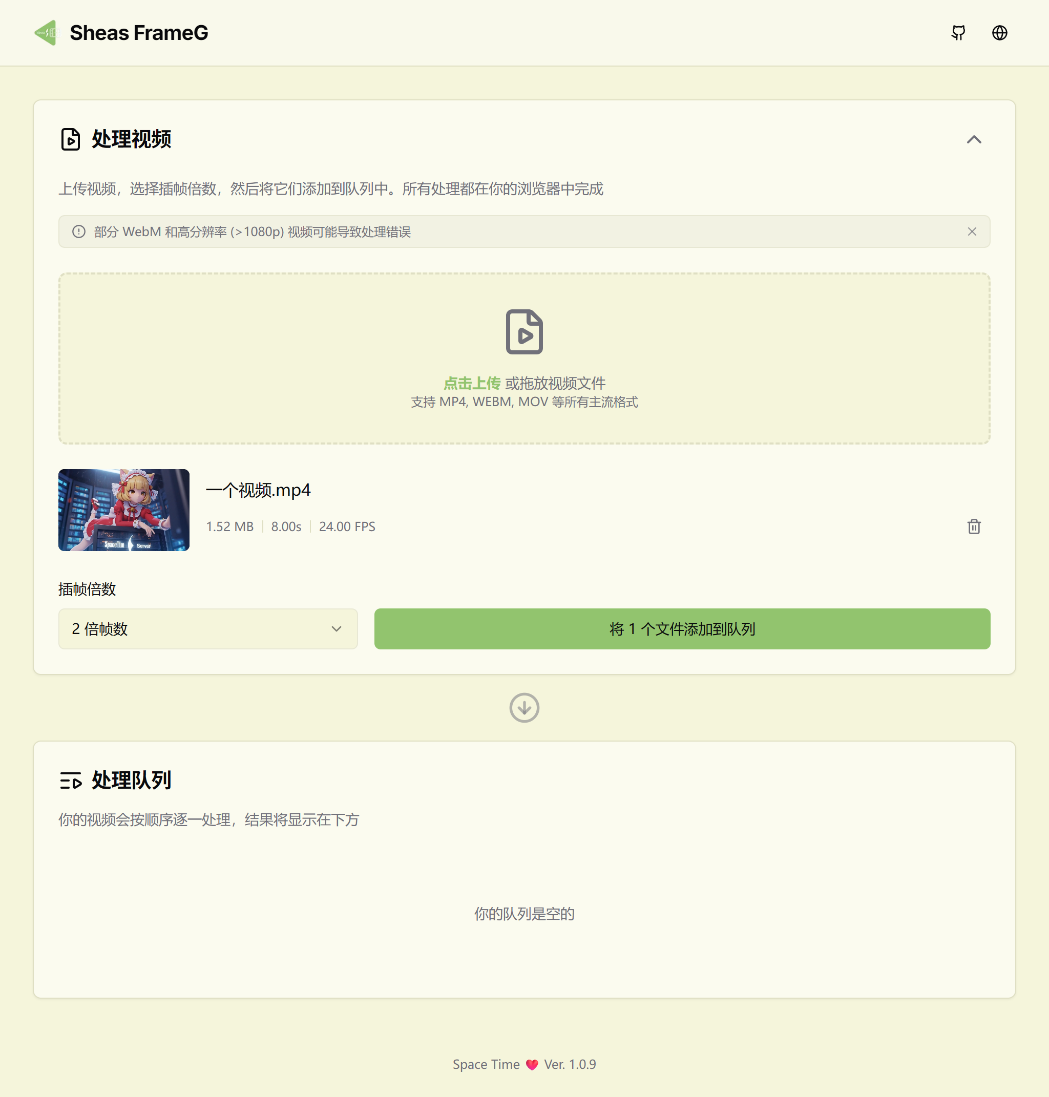 点右上角可以切换中英文语言,然后上传视频,选择插帧倍数,将文件添加到队列就可以了,视频会直接在本地浏览器中处理,不会上传到任何地方,处理完可以直接预览和下载