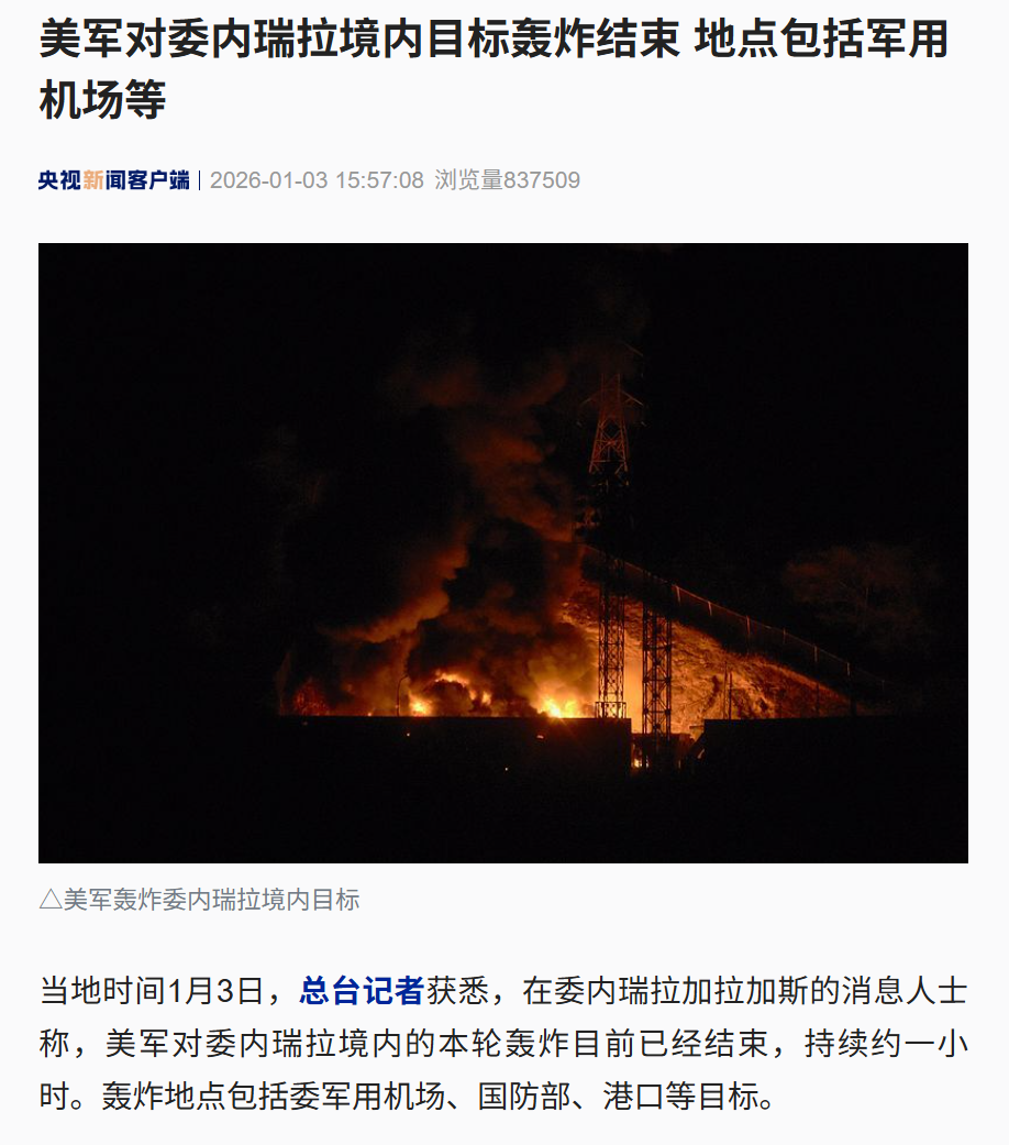 当地时间1月3日,总台记者获悉,在委内瑞拉加拉加斯的消息人士称,美军对委内瑞拉境内的本轮轰炸目前已经结束,持续约一小时。轰炸地点包括委军用机场、国防部、港口等目标。