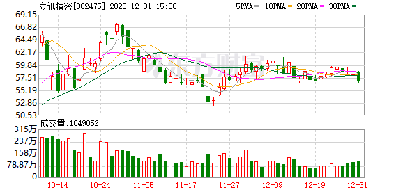 Wind数据显示,截至2025年12月31日收盘,立讯精密股价报56.71元/股,跌2.34%,最新市值为4132亿元。
