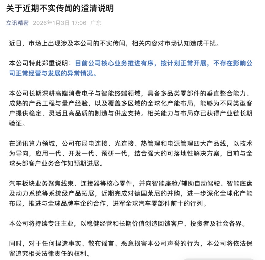 1月3日晚,消费电子行业龙头立讯精密在其微信公众号发布《关于近期不实传闻的澄清说明》。