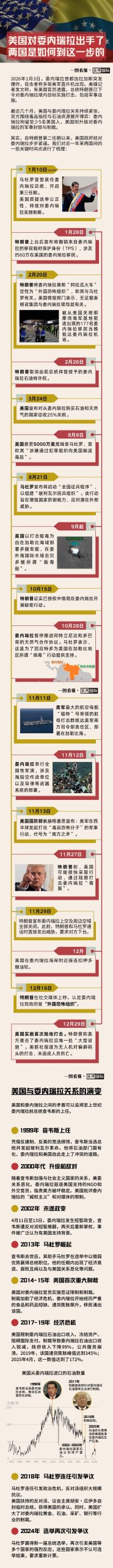 Home世界一图看懂|特朗普称抓获马杜罗 美国和委内瑞拉如何走到这一步? 世界 2026 年 1 月 4 日 一图看懂|特朗普称抓获马杜罗 美国和委内瑞拉如何走到这一步? By 古方信息网 - Advertisement - 据新华社报道,美国总统特朗普称已抓获委内瑞拉总统。 特朗普1月3日在社交媒体上宣布,美国已经“抓获”了委内瑞拉领导人尼古拉斯·马杜罗及其妻子,并将他们带离委内瑞拉。他证实,美国对委内瑞拉发动了“大规模打击”,此次行动与美国执法部门联合进行。详情稍后公布。他将于美国东部时间3日11时在海湖庄园举行新闻发布会。 (澎湃新闻) 文章转载自 东方财富 - Advertisement - Must Read 期货 央行、外汇局最新通知!上调部分银行境外贷款杠杆率 古方信息网 - 2026 年 4 月 15 日 - Advertisement - 基金 中韩半导体ETF华泰柏瑞(513310)将于2026年4月16日开市起至当日10:30停牌 2026 年 4 月 15 日 股票 《原神》正式发布全新五星角色;百奥《乱涂!彩世界》4月28日全平台公测丨游戏早参 2026 年 4 月 15 日 24小时 王石委托律师发布声明:“被抓”纯属恶意捏造 人身自由不受任何限制 2026 年 4 月 15 日 Related News 期货 央行、外汇局最新通知!上调部分银行境外贷款杠杆率 2026 年 4 月 15 日 基金 中韩半导体ETF华泰柏瑞(513310)将于2026年4月16日开市起至当日10:30停牌 2026 年 4 月 15 日 股票 《原神》正式发布全新五星角色;百奥《乱涂!彩世界》4月28日全平台公测丨游戏早参 2026 年 4 月 15 日 24小时 王石委托律师发布声明:“被抓”纯属恶意捏造 人身自由不受任何限制 2026 年 4 月 15 日 期货 消息人士称美伊“原则上同意”延长停火 2026 年 4 月 15 日 - Advertisement -