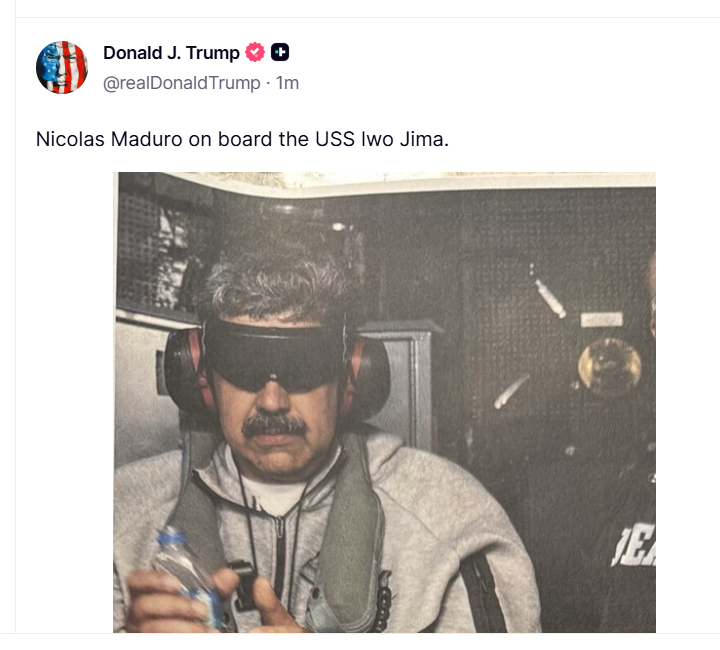 (记者会前,特朗普在社交媒体发布马杜罗在美军舰上戴手铐、双眼被蒙住的照片)