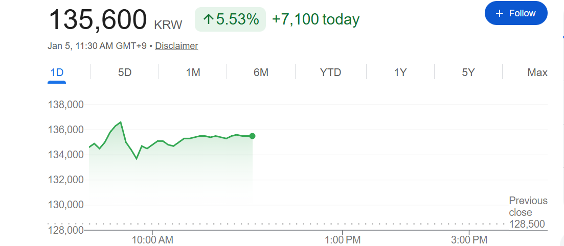 这番乐观表态,促使三星的股价继续上涨,周一早间一度飙升超过6%,创下136800 元的历史新高,同时也支撑韩国综合股价指数(KOSPI)上涨超2.6%。