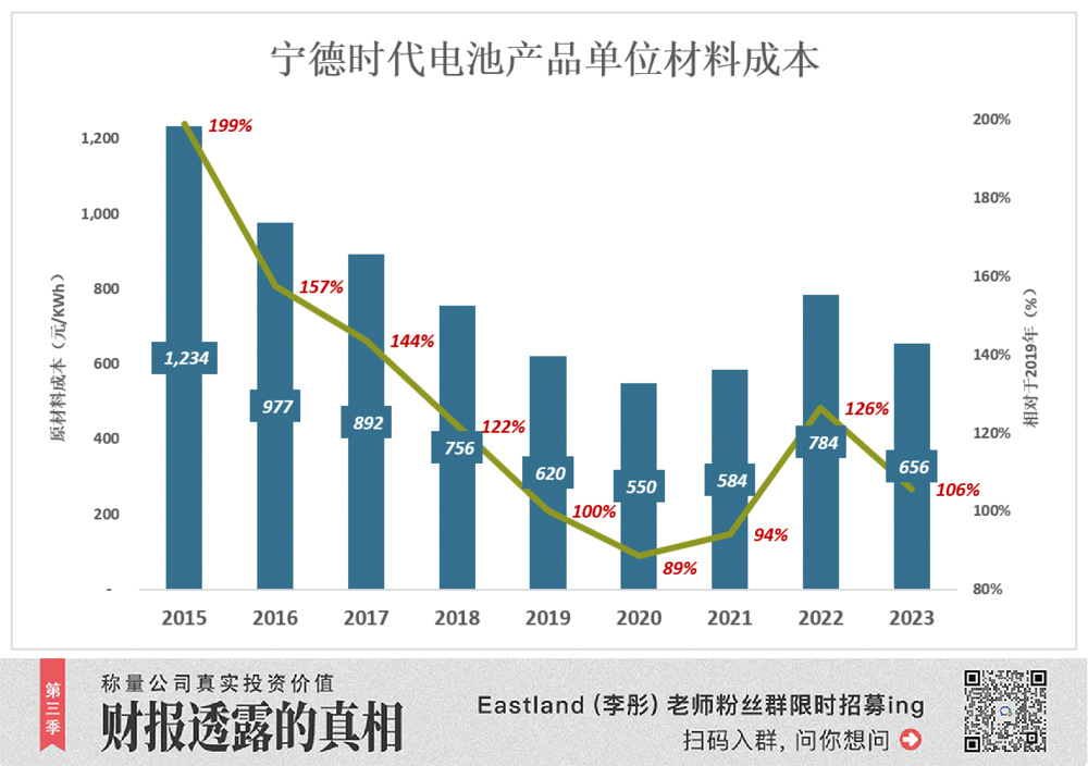 2022年赣锋产品每吨35.5万元、较2019年上涨313%;宁德时代单价974元/KWh、同比上涨23.7%,但较2019年涨幅仅为1.8%。也就是说,宁德时代把锂材料价格波动滤掉99.4%!