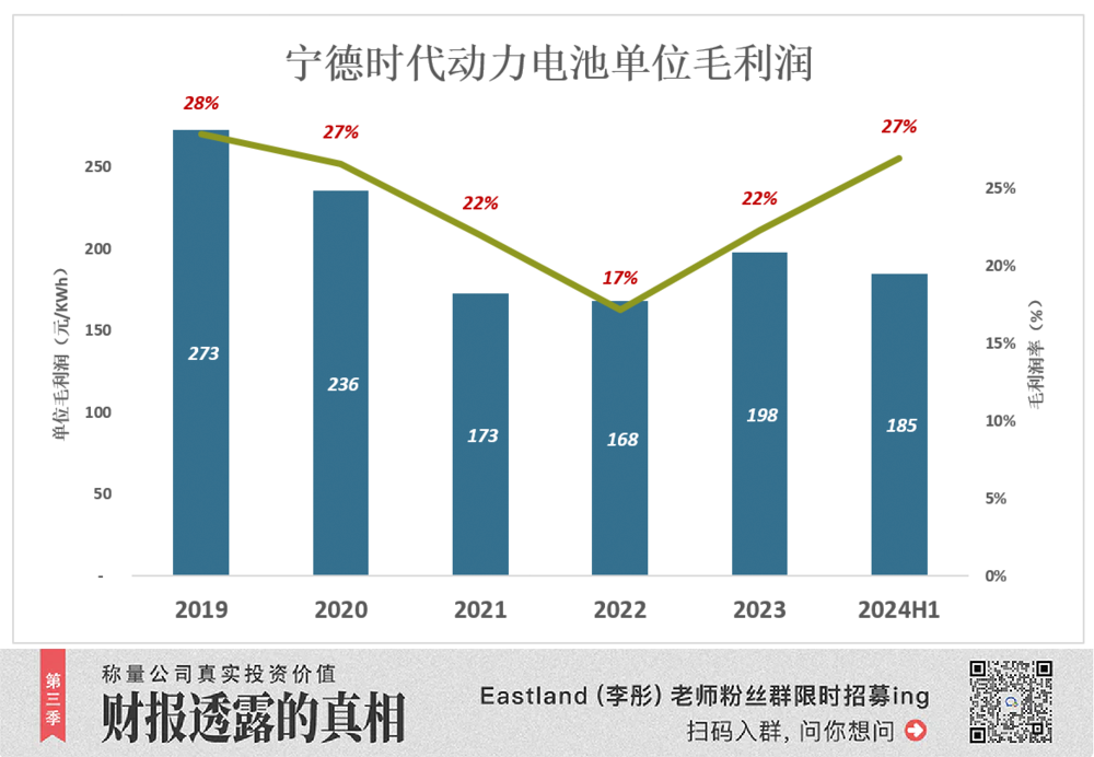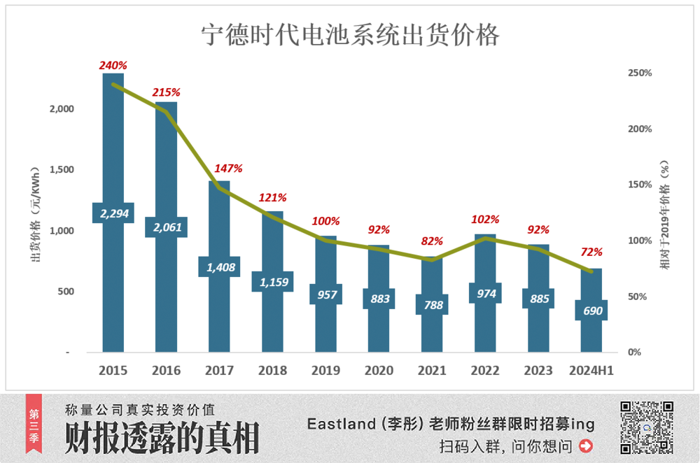 也是由于长期采购协议和囤货,当碳酸锂价格暴跌,宁德时代不能充分享受红利。与2022年锂材料高点相比,2023年多赚5个点、2024年H1多赚10个点,只吃到两、三成红利。