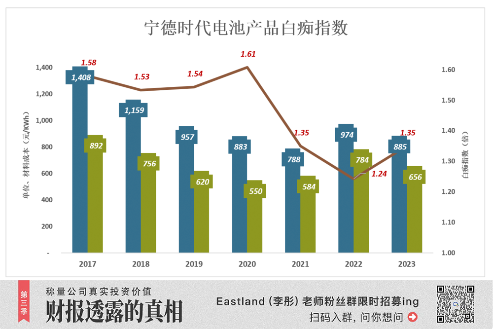 2019年,宁德时代电池系统(动力电池、储能电池)出货价为957元/KWh,原材料成本为620元/KWh。“白痴指数”为1.54倍。