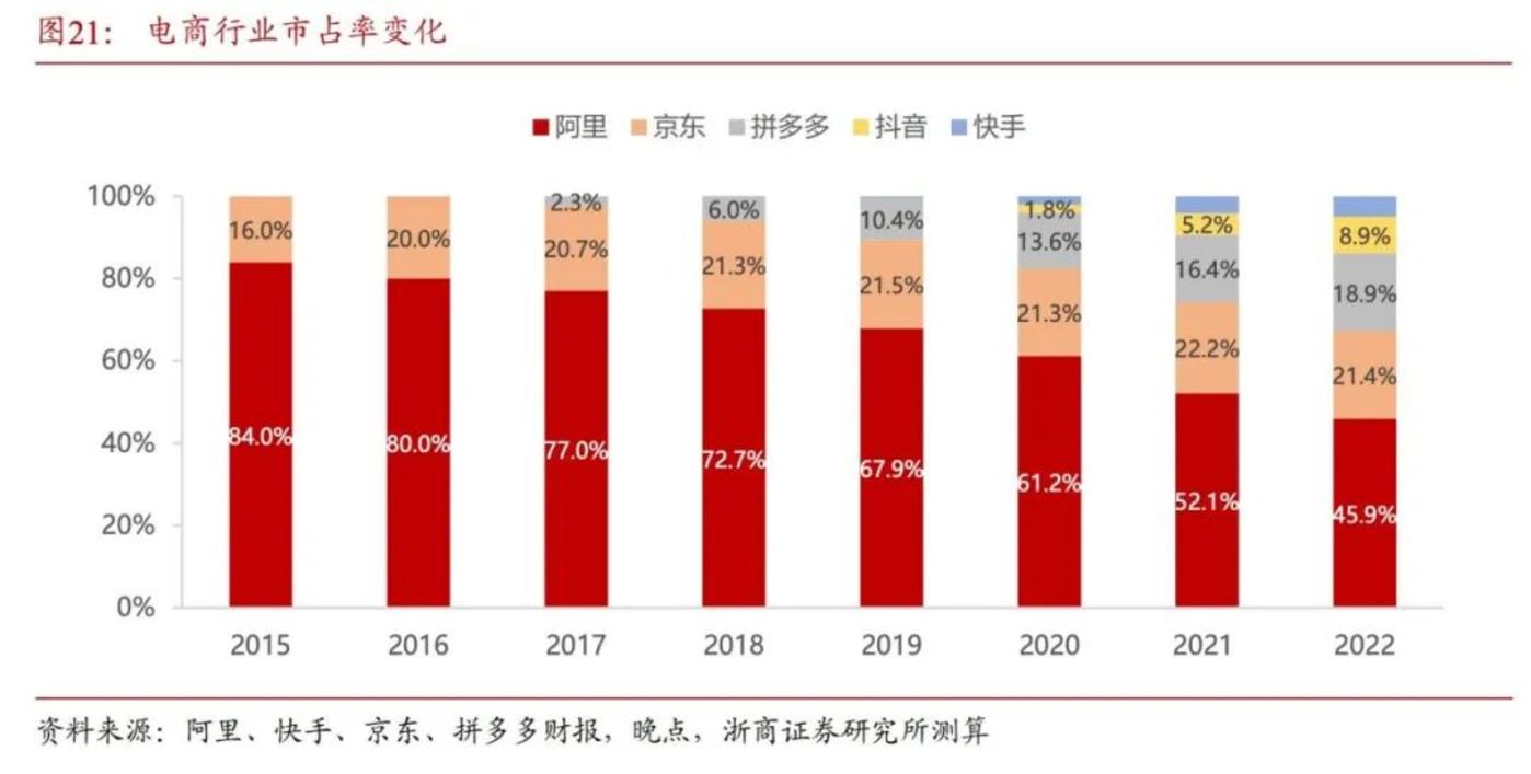 2015年,阿里和京东把控中国电商话语权,据浙商证券研究所测算,二者市场份额呈“八二分”格局。也就在这一年,拼多多正式成立,看似牢不可破的电商格局,被拼多多撕开了一个口子。