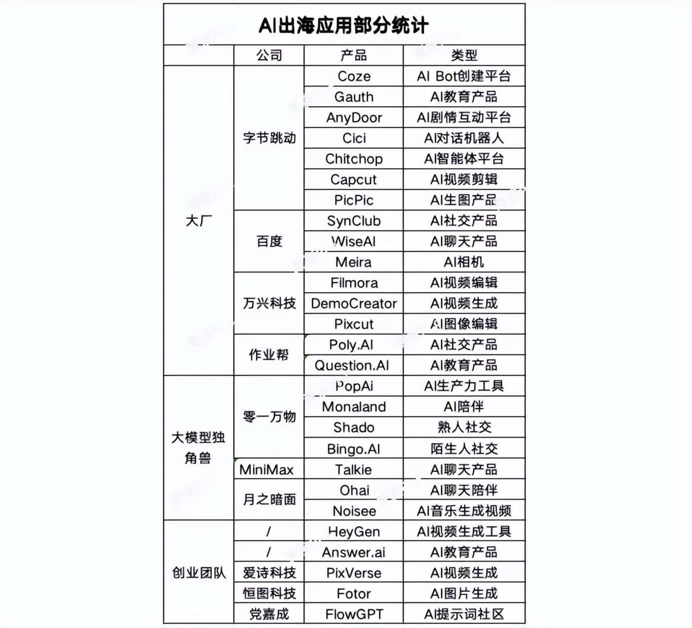 这“三大势力”推出的AI出海产品,大多集中在AI聊天陪伴、AI图像生成、AI视频生成、AI搜索、AI生产力工具等生成式AI有明显提升的领域。