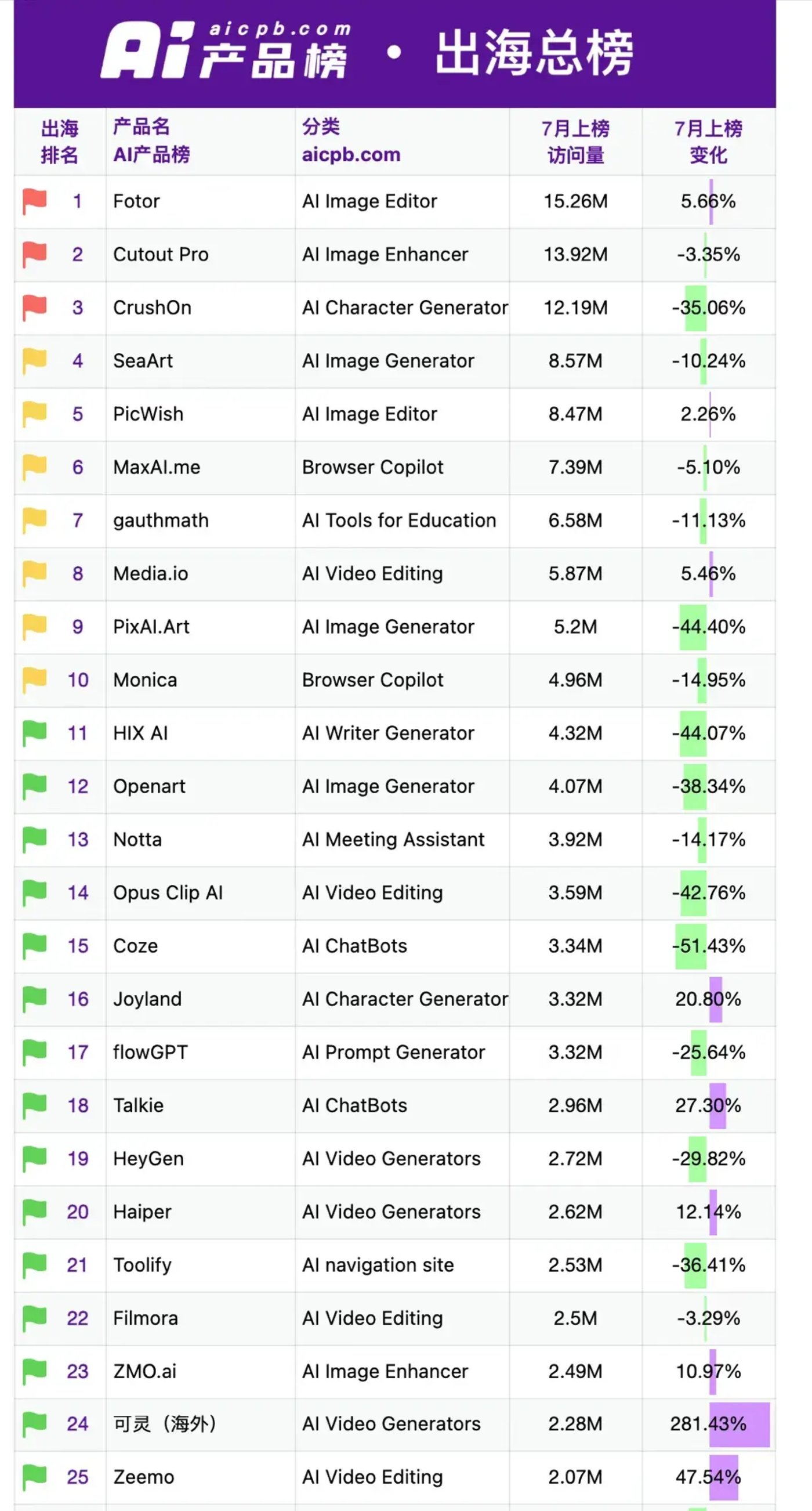 同时,更值得注意的是,根据这个榜单的统计,在这50款产品中,只有刚上线不久的可灵海外版访问量大幅上升,大多数产品表现平稳,甚至很多产品的访问量都在下滑。