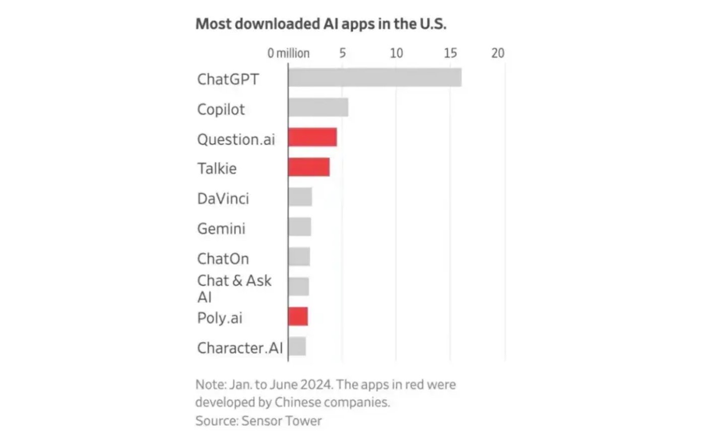 在Sensor Tower关于上半年美国AI应用市场下载量的统计中,前十款中至少有三款是中国企业。其中,AI教育应用Question.ai和AI聊天应用Poly.ai都来自“教育大厂”作业帮,另一款产品AI聊天机器人Talkie则来自AI大模型独角兽MiniMax。