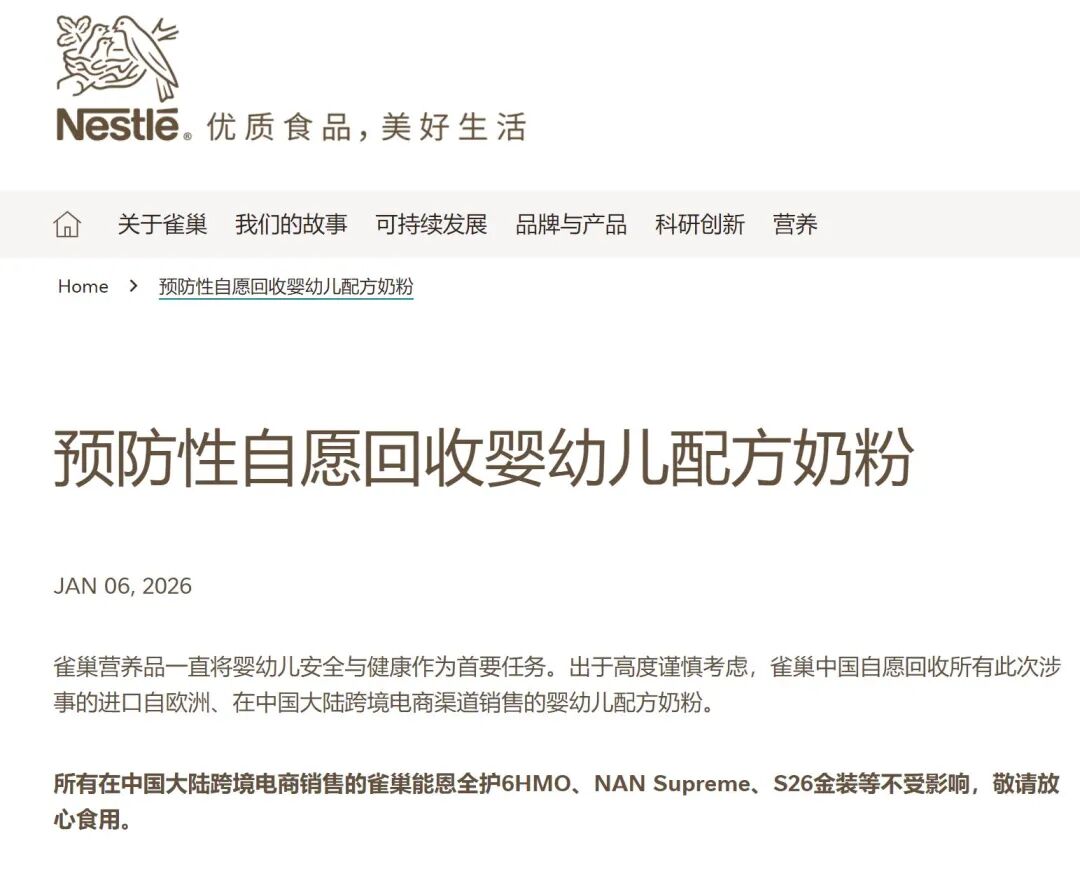 《每日经济新闻》记者注意到,1月6日,雀巢中国在其官网也发布了预防性自愿回收婴幼儿配方奶粉的公告。公告称,雀巢中国自愿回收在中国大陆销售的特定批次婴幼儿配方奶粉,受影响产品涉及力多精、铂初能恩、舒宜能恩、惠氏多批次产品。另外,雀巢中国也自愿回收所有此次涉事的进口自欧洲、在中国大陆跨境电商渠道销售的婴幼儿配方奶粉。