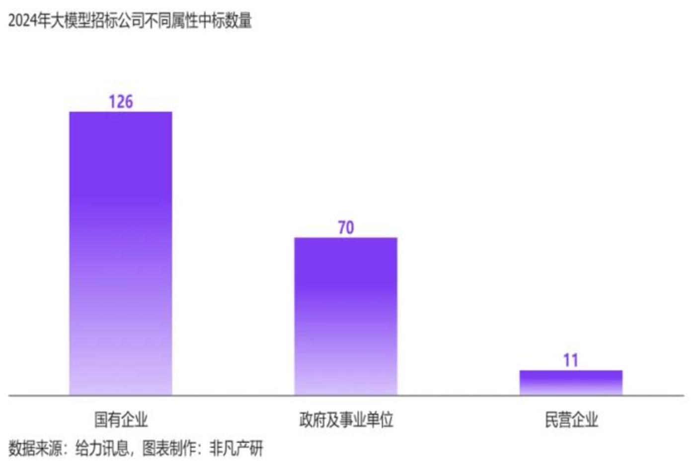 据给力讯息和非凡产研联合发布的《2024年上半年中国AIGC行业商情报告》显示。2024年上半年,大模型中标数量共计207个。其中,国有企业占据了主导地位,共计126家,较去年全年相比,上半年增长110%。国有企业累计中标金额连续两年最高,2024年上半年累计中标金额3.7亿元,涉及众多行业和领域,如能源、交通、通信、金融等。