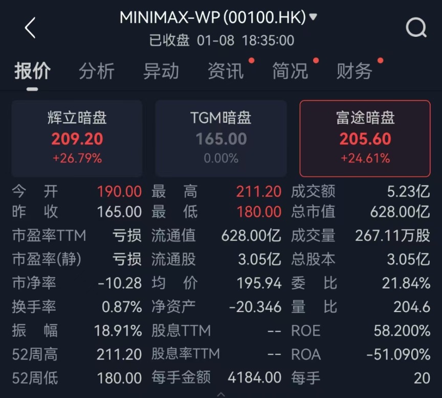 1月8日的暗盘环节,MiniMax在富途暗盘收涨24.61%,报205.6港元/股,按每手20股估算,不计手续费,一手赚812港元。从行情数据来看,其富途暗盘当天成交额达到了5.23亿港元。辉立暗盘亦有3.72亿港元的成交额,最终收涨26.79%。