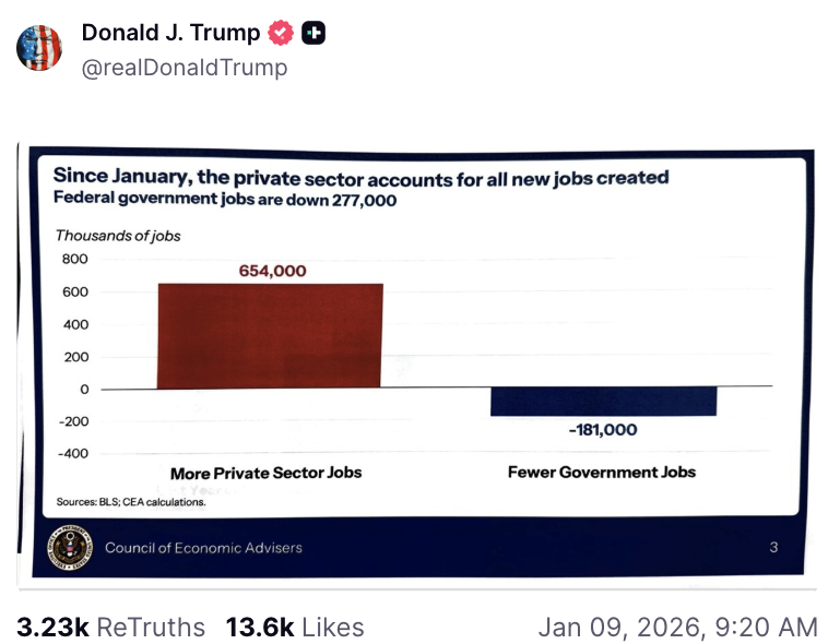 具体来说,在非农数据发布12个小时前(北京时间周五早晨),美国总统在社交媒体上发布了一份白宫经济顾问委员会的PPT。其中有一页显示,在他第二个任期的首年,美国私营部门就业增加了65.4万个工作岗位,而联邦政府的就业人数减少了18.1万人。