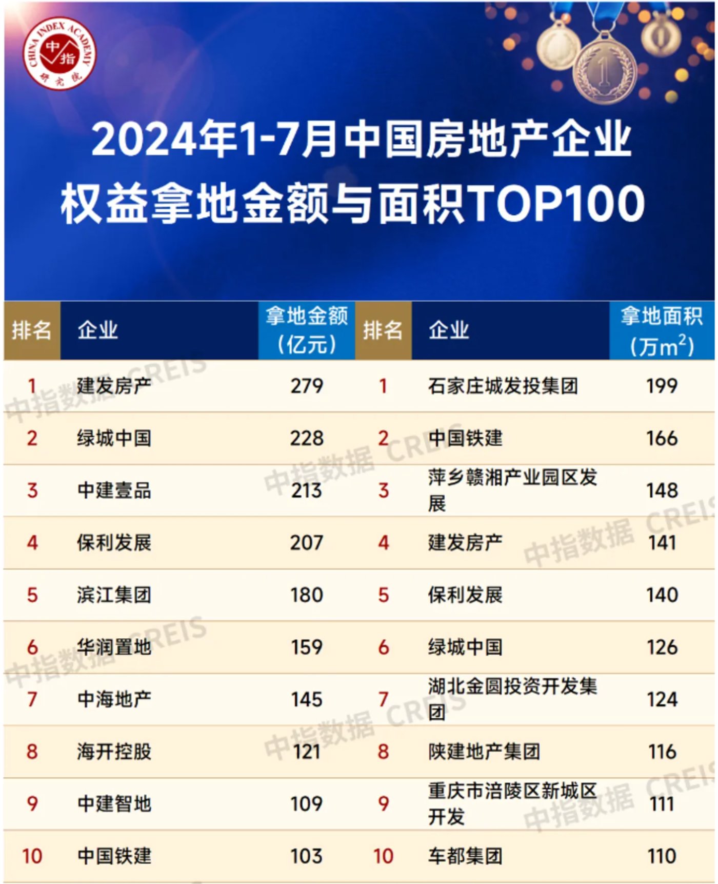 中铁建、中建系这类企业现在依然是拿地主角。根据中指研究院今年1-7月的数据,中建壹品、中铁建、中建智地等登上了拿地金额前十名。