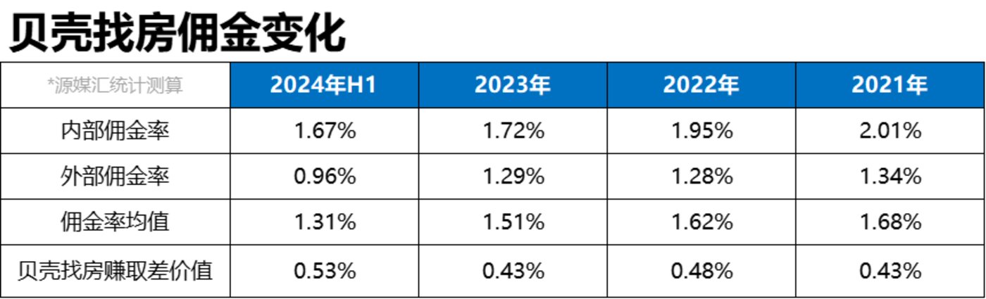 今年上半年,贝壳找房下调了佣金率。其中,内部佣金率为1.67%,外部佣金率为0.96%,平台赚钱差价值为0.53%。相比2023年末,佣金率出现了较大幅度的下降。