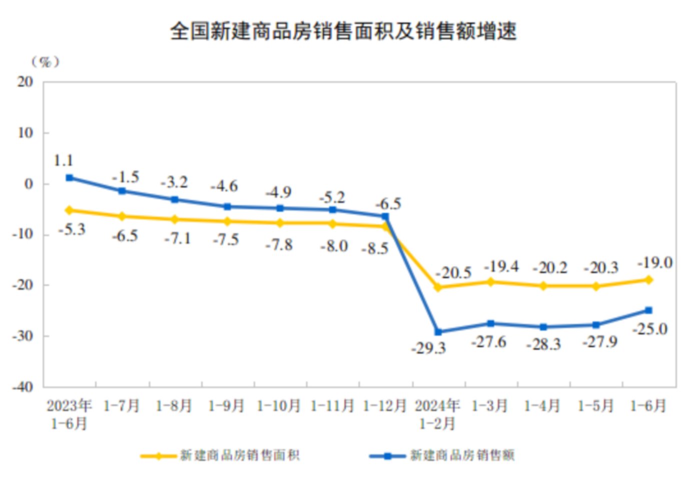 来自国家统计局的数据,今年1-6月,新建商品房销售额47,133亿元,下降25%,其中住宅销售额下降26.9%;销售面积47,916万㎡,同比下降19%。
