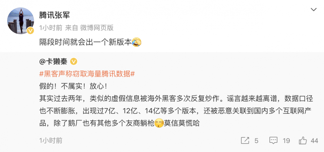 腾讯公关总监张军转发微博称,“隔段时间就会出一个新版本”。这类谣言除了腾讯,也有其他友商躺枪,提醒用户莫信莫慌。(周小白)