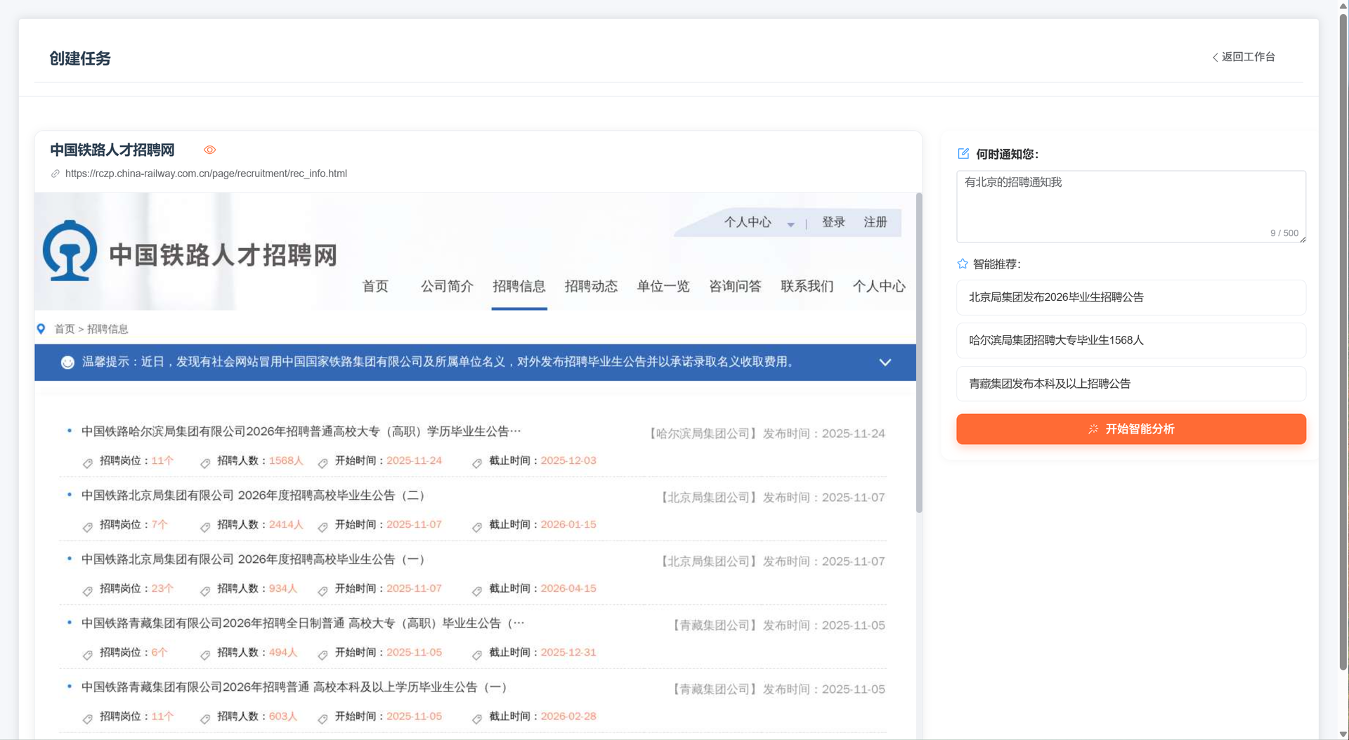 - 某事业单位的招聘公告页 URL + “有行政、文书类岗位的招聘公告,通知我”